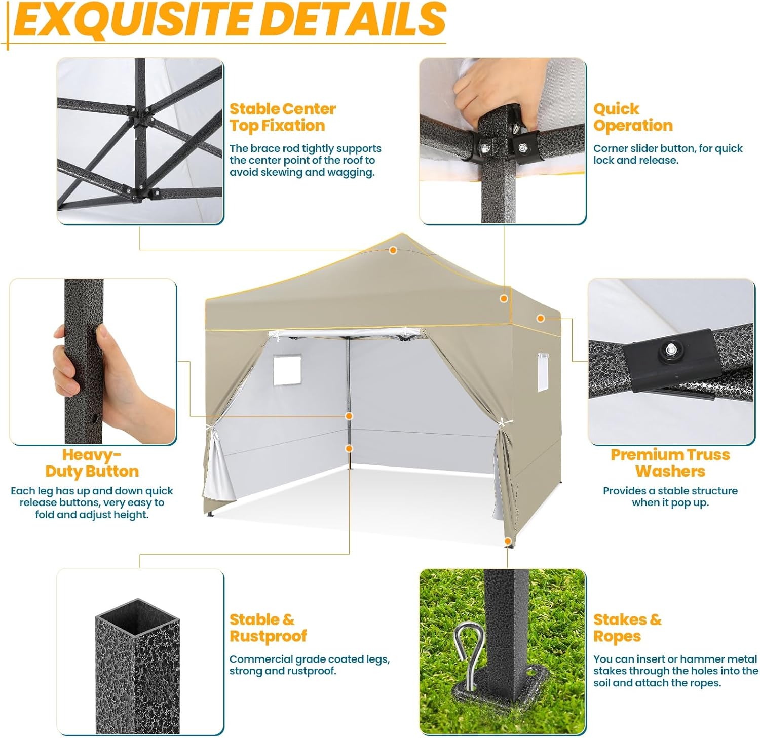 【Sturdy Metal Frame】The tent for backyard is constructed by all steel frame.The metal legs measure 30x30mm and are 0.6mm thick, which is strong, durable and rust-resistant. Use the included ground stakes and ropes to increase the stablility of the canopy.