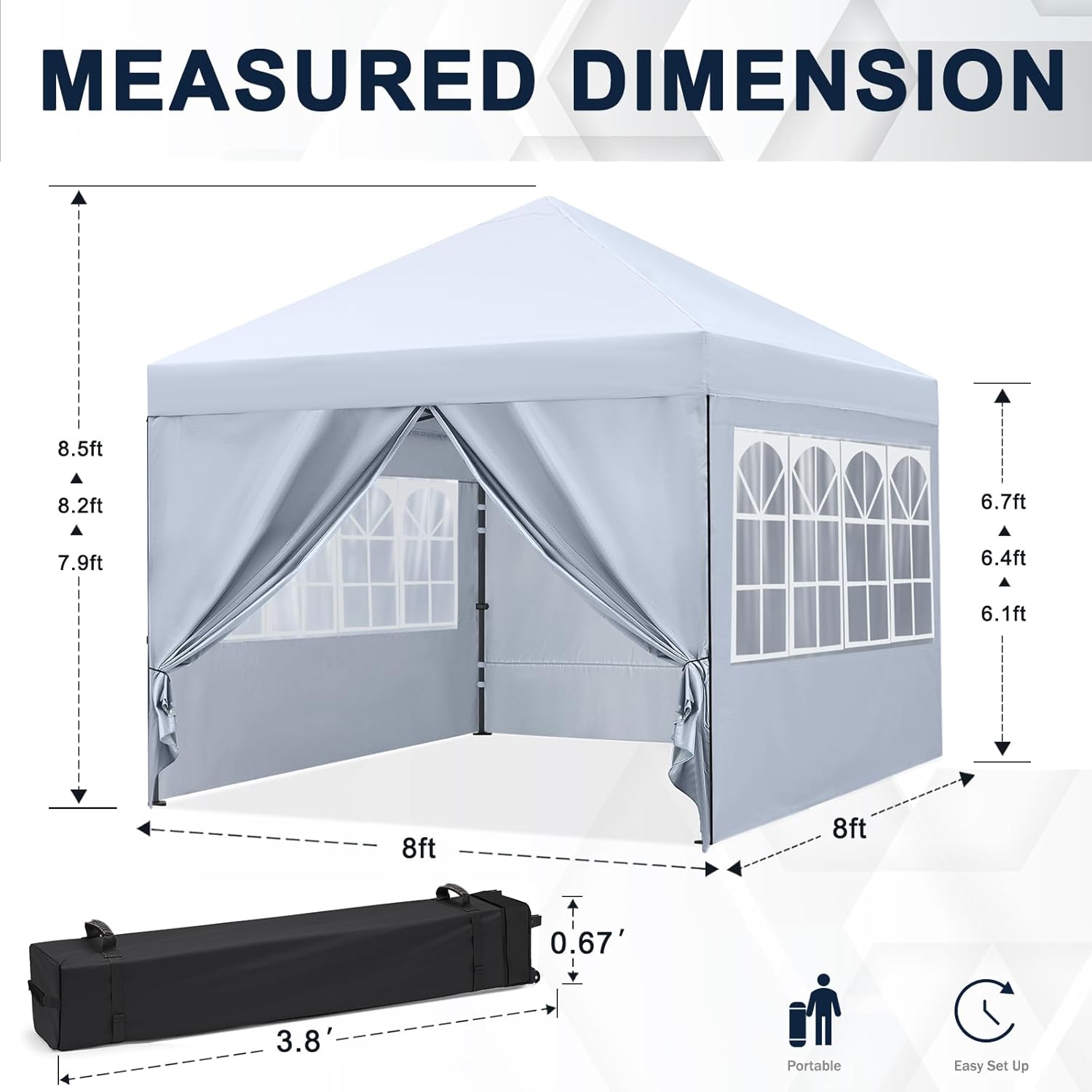 【Package Includes】Canopy comes with a full set of accessories, no need to purchase additional other items. 8’x8′ Pop Up Canopy Frame,8’x8′ Canopy Top Cover,2 removable Sidewalls with Zipper,2 removable Sidewall with Church Window,4 Sandbags, 600D Oxford Fabric Roller Bag, 8 Stakes ,4 Ropes,Manual.