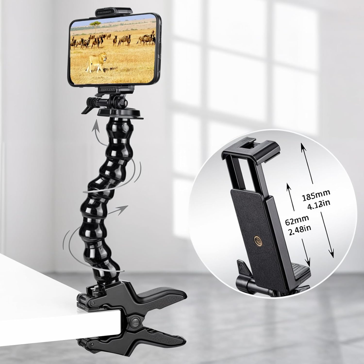 Gooseneck Phone Holder Flex Clamp Clip Mount with Flexible Jaws for Desk, Pole, or Mobile Stand Adjustable Compatible with iPhone 14, 13 Pro, XS Max, XR, X, 8, 7, 6, 6s Plus and Other 4-7” Device