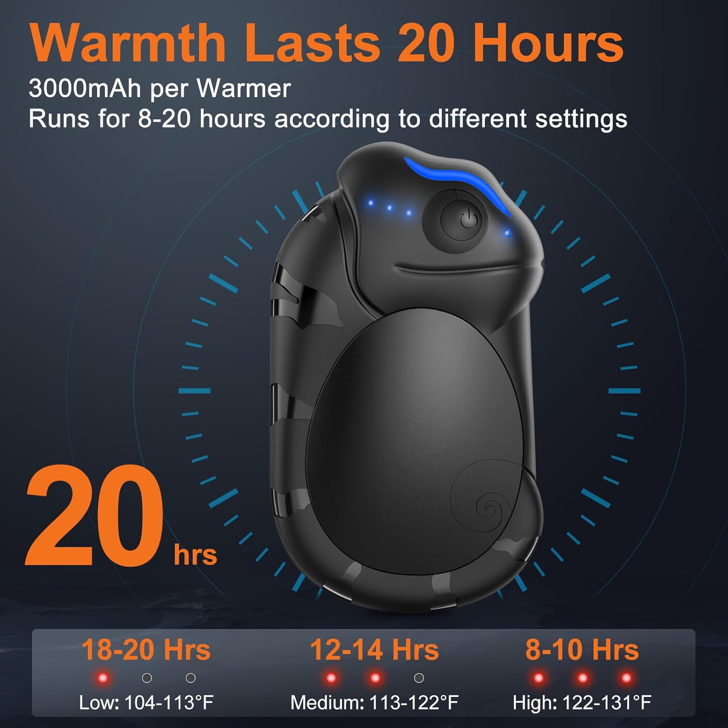 20Hrs Ongoing Warmth — Equipped with a 3000mAh*2 battery, these hand warmers are built for long-lasting performance. Once fully charged, they can keep you warm for anywhere between 8 to an impressive 20 hours. Fully charged just 3-4 hours, so you can count on them to provide continuous warmth whenever you need it.