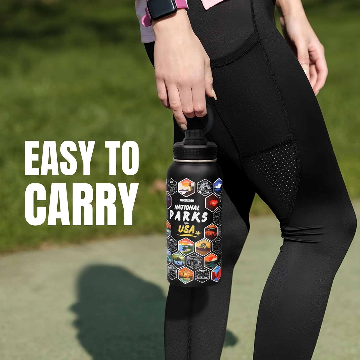 Hiker’s Go National Parks Water Bottle – 32oz Insulated Stainless Steel with Magnetic Phone Holder Leakproof Lid & 63 Waterproof Stickers – Great for Hiking, Camping & Gift Giving
