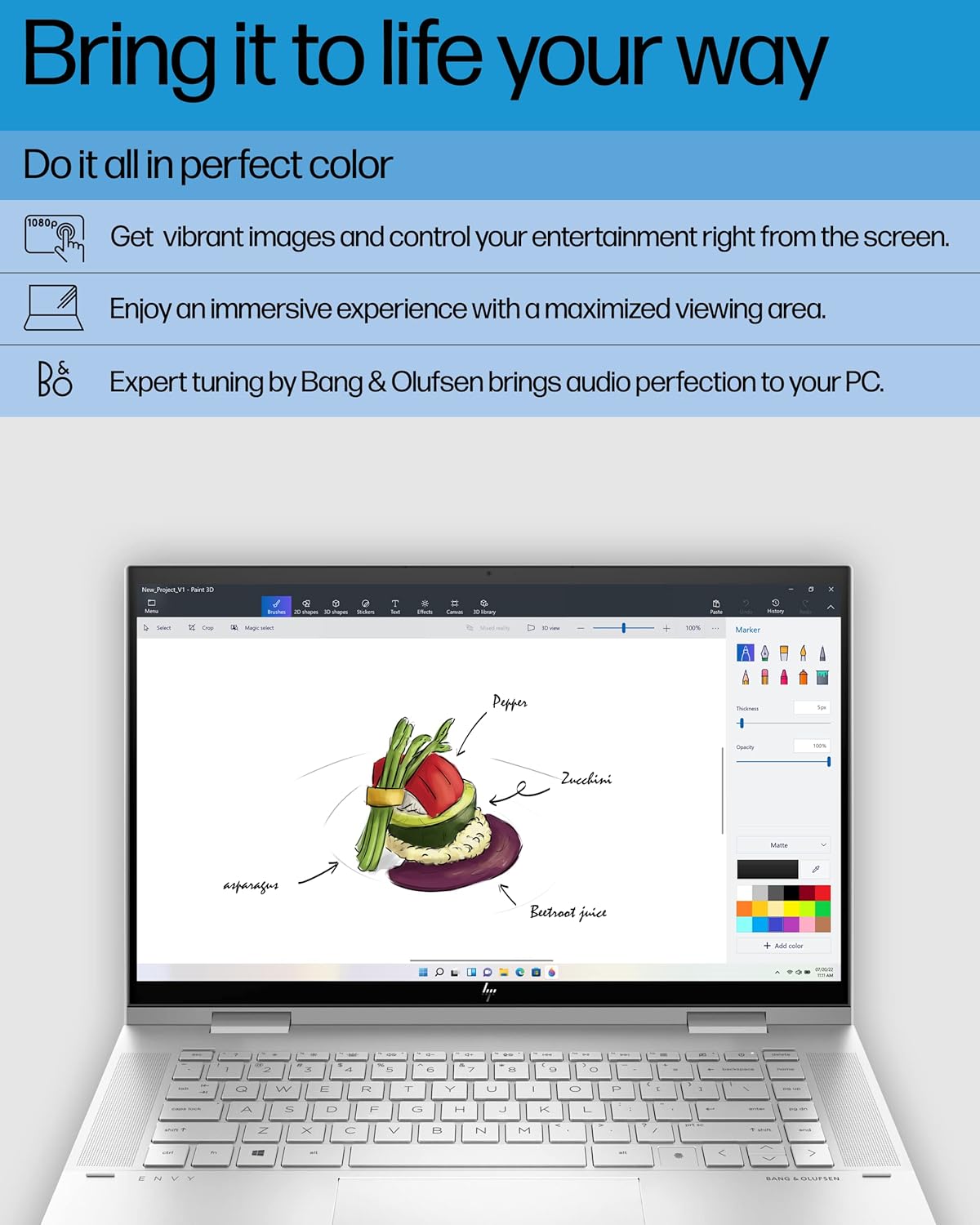 Let your creativity run wild with the HP ENVY x360 Convertible Laptop. See all of your content unobstructed on a 15.6-inch edge-to-edge, FHD, IPS touchscreen (1). Create on the go thanks to this HP laptop computer’s durable yet lightweight design. What’s more, its 360-degree hinge enables four distinct positions, perfect for getting comfortable wherever you are. Tackle every task with incredible speed and efficiency thanks to the power of your device’s 12th Generation Intel Core i7-1260P processor (2) with Intel Iris Xe Graphics (3). Work without slow-down with 8 GB DDR4-3200 MHz RAM, while safely saving all your photos and projects with 512 GB PCIe NVMe M.2 SSD storage (4) (5). Create in perfect color all day with up to 9 hours and 45 minutes of battery life (6). Plus, when you need a recharge, HP Fast Charge technology brings your laptop touchscreen computer from 0 to 50% charge in approximately 30 minutes (7). This Windows 11 laptop gives you a fresh perspective as you connect, game, and create in new ways thanks to its modern operating system (8) and super-smooth Wi-Fi 6E (2×2) and Bluetooth combo, supporting Gigabit data rate (9) (10). Up your productivity and expand across multiple devices as your HP ENVY x360 laptop sports a Thunderbolt™ 4 with USB4 Type-C 40Gbps signaling rate port (11) as well as the HP Quick Drop feature. Start designing with peace of mind thanks to HP’s 1-year limited warranty. Enjoy greater security while you work with a privacy camera shutter, dedicated mute button, and a fingerprint reader, plus easily collaborate with this HP laptop touchscreen’s Wide Vision camera, dual microphones (12), and expertly tuned speakers. HP is always innovating new ways to reduce its carbon footprint—that’s why this HP 15.6 laptop is built with sustainable materials (13,14,15), shipped in completely recyclable packaging (16), and is ENERGY STAR certified (17) and EPEAT Gold registered (18).