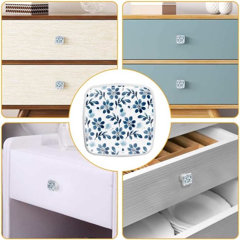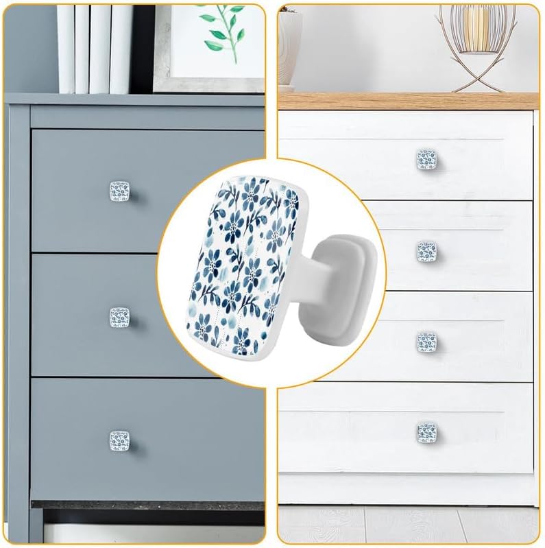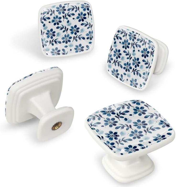 LORVIES 4 Pack 1.2″ Floral Decorative Cabinet Knobs, ABS Glass Square White Handles for Home Kitchen & Furniture – Enhance Your Living Space! (Blue Ceramic Flower 3)