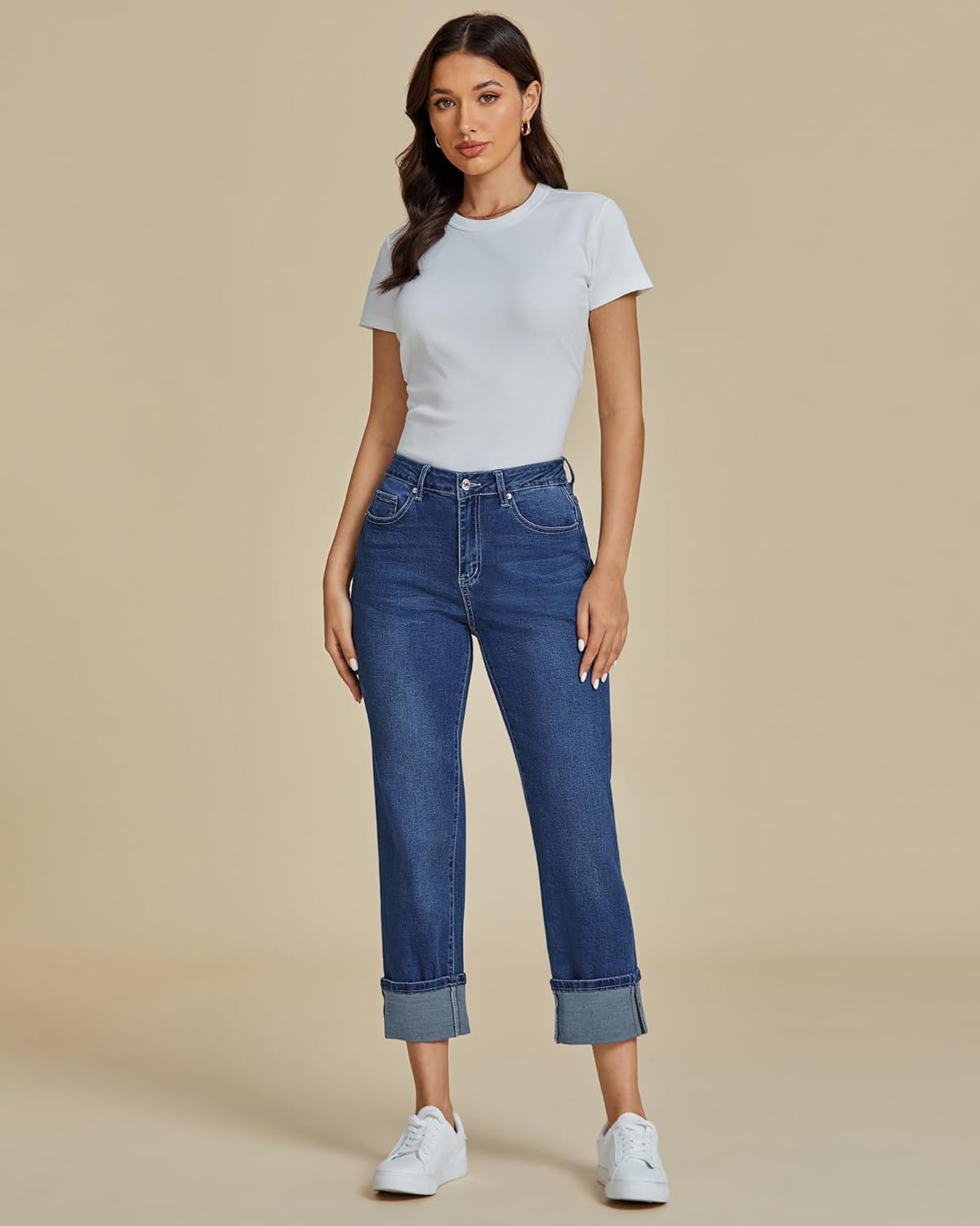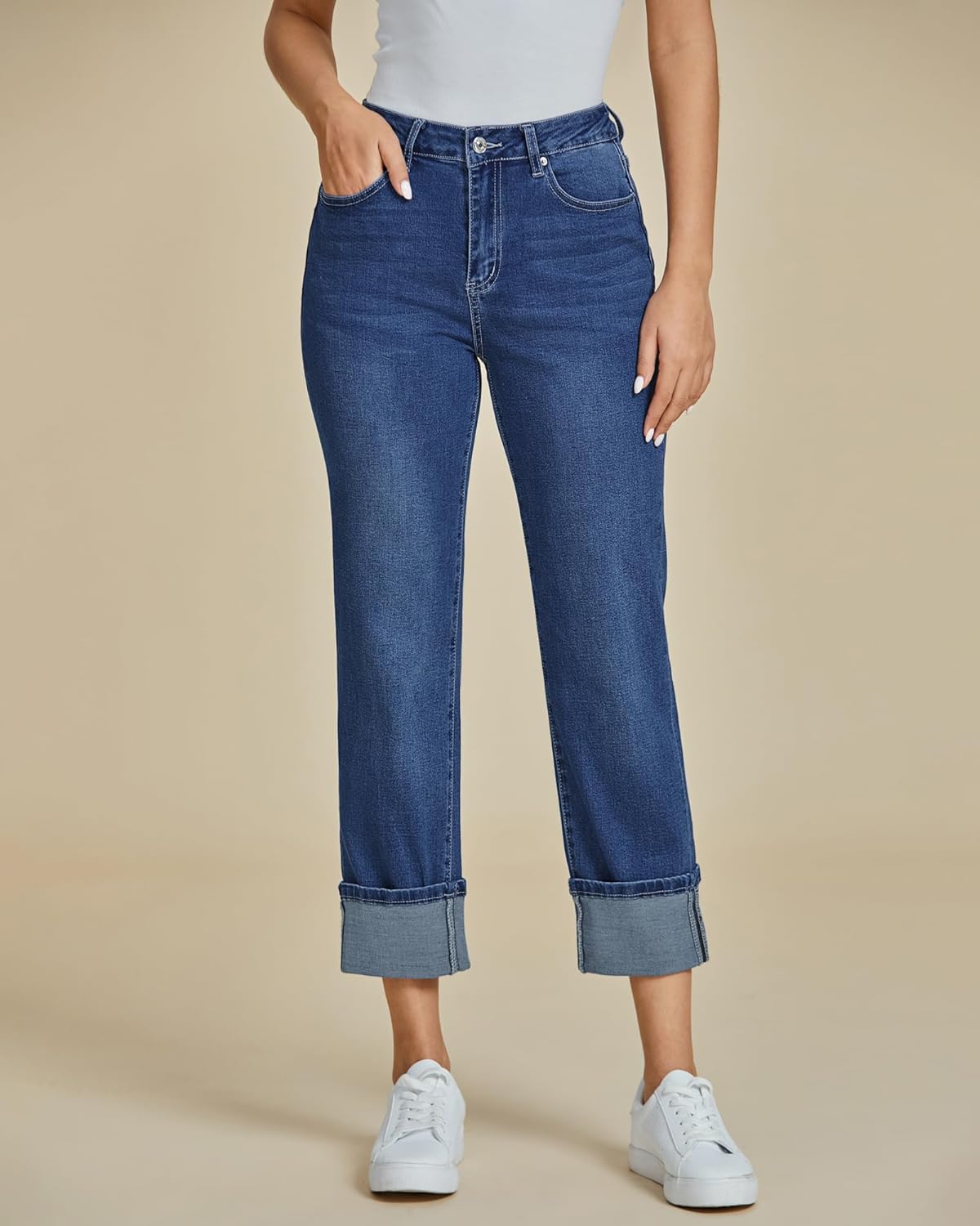 luvamia Straight Leg Jeans for Women Trendy Cropped High Waisted Cuffed Hem Stretchy Boyfriend Capri Jeans with Pockets