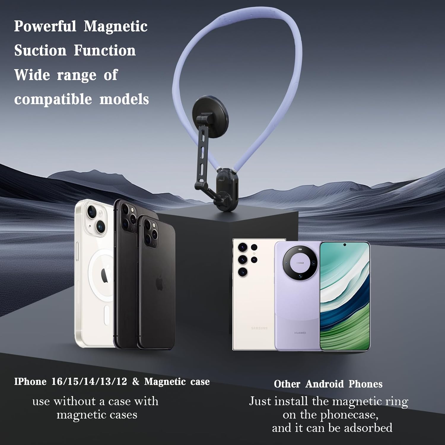 【Package Contents】 Magnetic Neck Tripod Kit includes: 1 x Magnetic Neck Stand, 2 x Magnetic Sheet (for smartphones other than 12-16 series), 1 x Cleaning Kit (for non-magnetic phone to wipe the back case), 1 x Safety Strap, 1 x Tie Strap (for fixing the stand), 1 x Instruction Manual