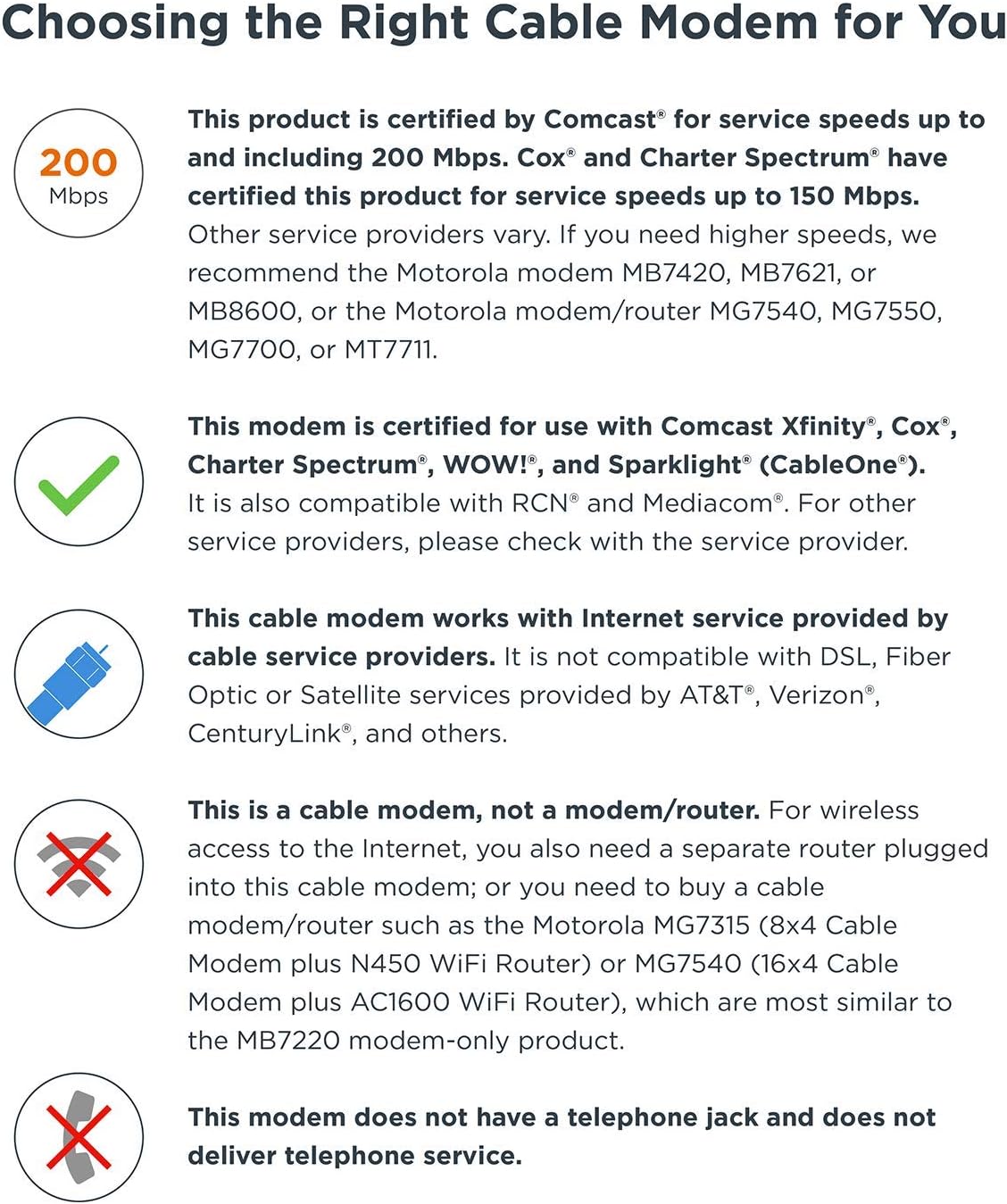 MOTOROLA 8×4 Cable Modem, Model MB7220, 343 Mbps DOCSIS 3.0, Certified by Comcast XFINITY, Time Warner Cable, Cox, BrightHouse, and More (No Wireless)