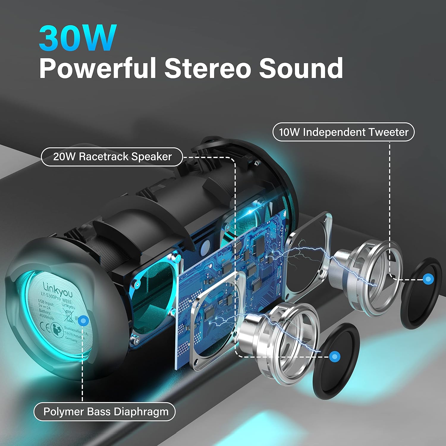OPG Linkyou Wireless Speakers Portable Outdoor Speaker with 30W Stereo Sound, IPX7 Waterproof Shower Speaker,Upgraded Portable Speaker for Home/Party/Outdoor/Beach, Up to 30 Hours Playtime, LED Light