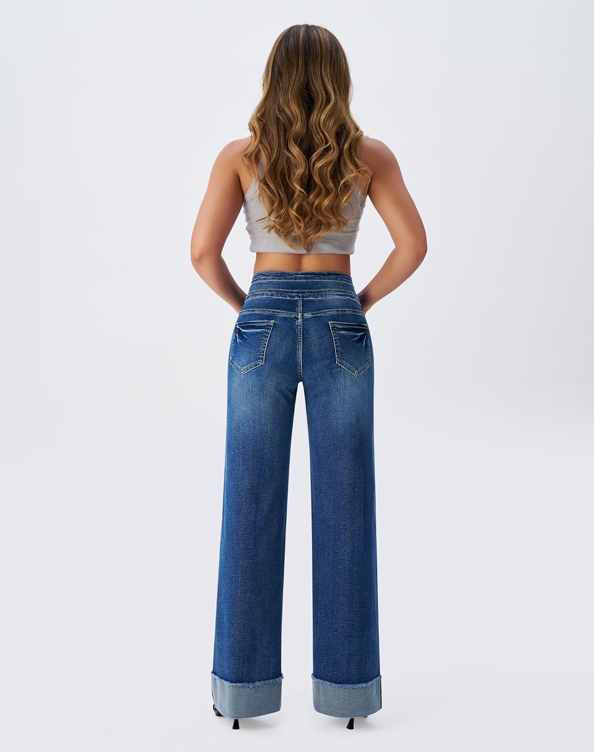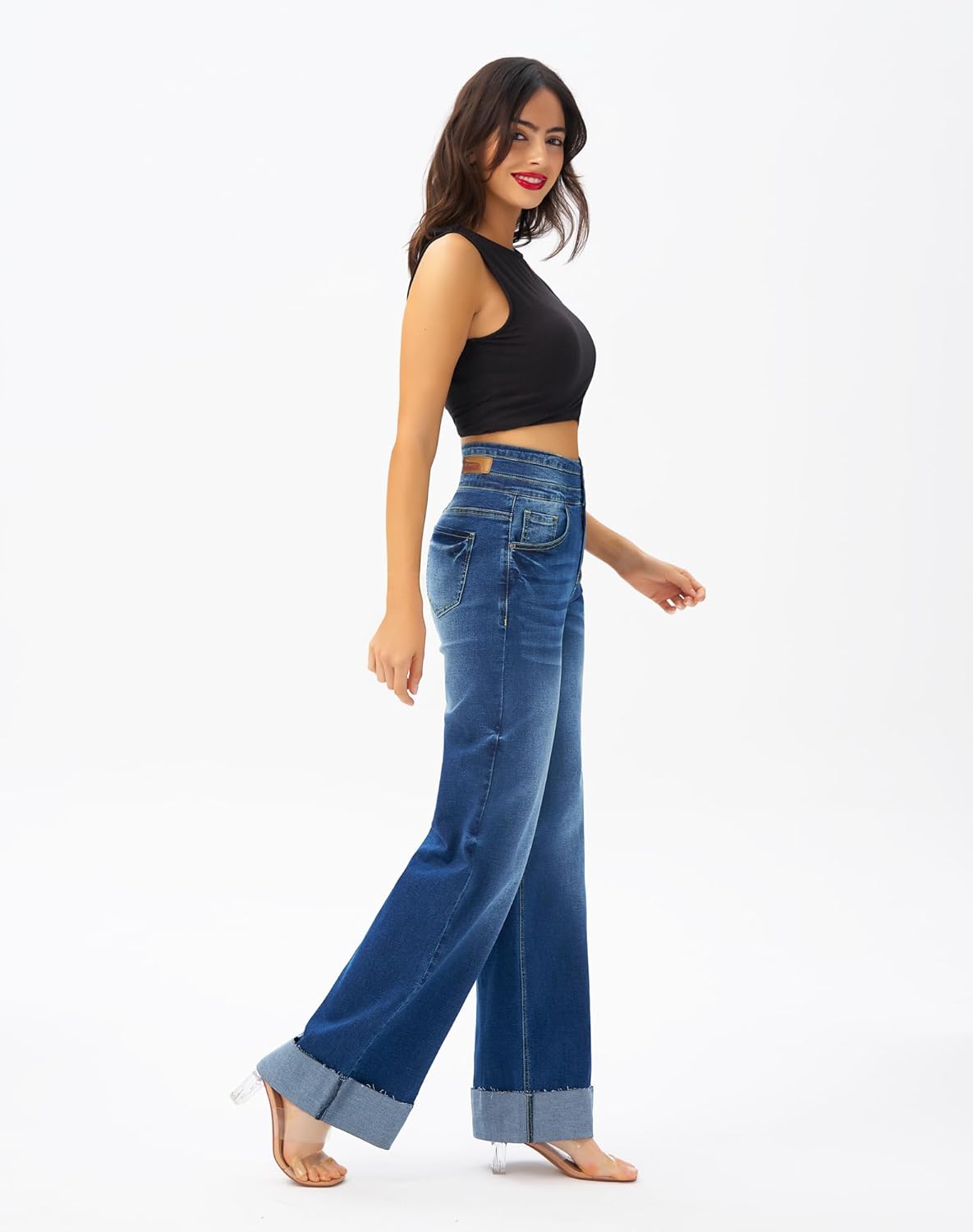 roswear Women’s High Waisted Stretchy Wide Leg Jeans Cuffed Baggy Jeans Loose Denim Pants