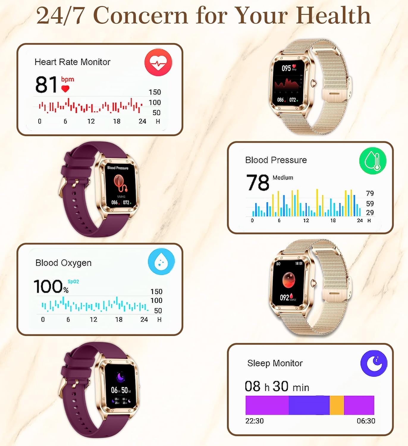 24/7 Heart Rate Monitor & Sleep Tracker: The smart watch with blood pressure monitor uses advanced sensors to accurately monitor heart rate, blood oxygen, and blood pressure. (Non-medical device, the data is for reference only) Sleep Tracker can automatically track your sleep and analyze your sleep quality (deep sleep, light sleep, and wake) to help you adjust your lifestyle. The android smartwatch also have menstrual cycles, sedentary, and water-drinking reminders.