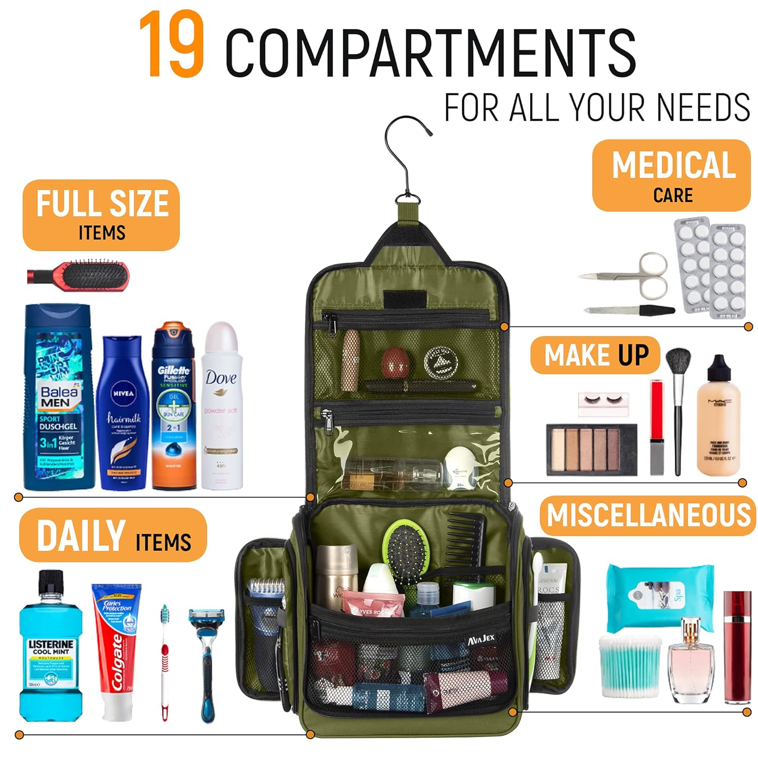 Travel Toiletry Bag for Men and Women – Large Hanging Toiletry Organizer – Waterproof Hygiene Bag with Metal XXL Swivel Hook, with YKK Zippers and 19 Compartments for Toiletries, Makeup, Cosmetics